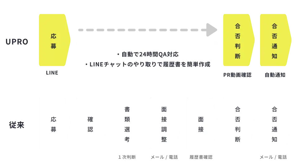 - 応募があったらパソコンかUPROと連携したLINEから応募者情報を確認、チャットでやり取りも可能です。